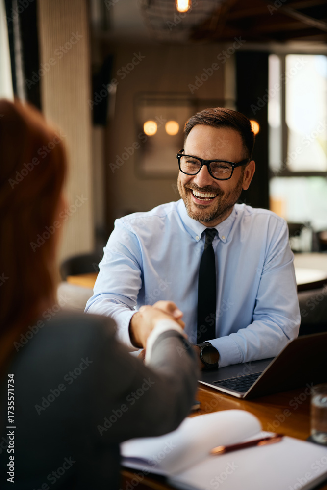 Happy business coworkers handshaking during meeting in cafe. #1735571734