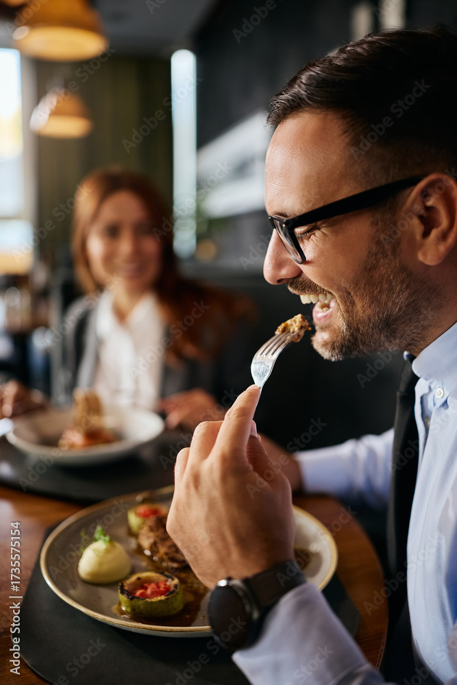 Happy businessman eating lunch with female colleague in restaurant. #1735575154