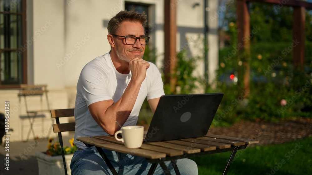 Happy businessman working remotely in garden. Mature man using laptop computer outdoor in morning with coffee. Male entrepreneur freelancer tele working online in home office. Digital business life. #1579561251