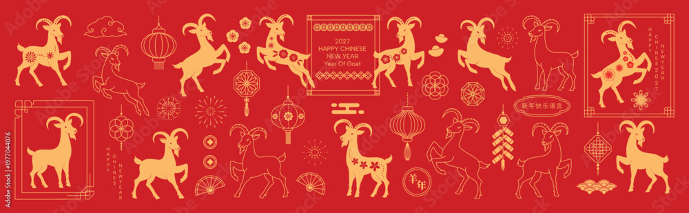Happy Chinese New Year 2027 goat vector set. Red and gold zodiac animal collection with ornamental frames, lantern, flowers, firecrackers and festive Chinese decorative elements. #1977044076