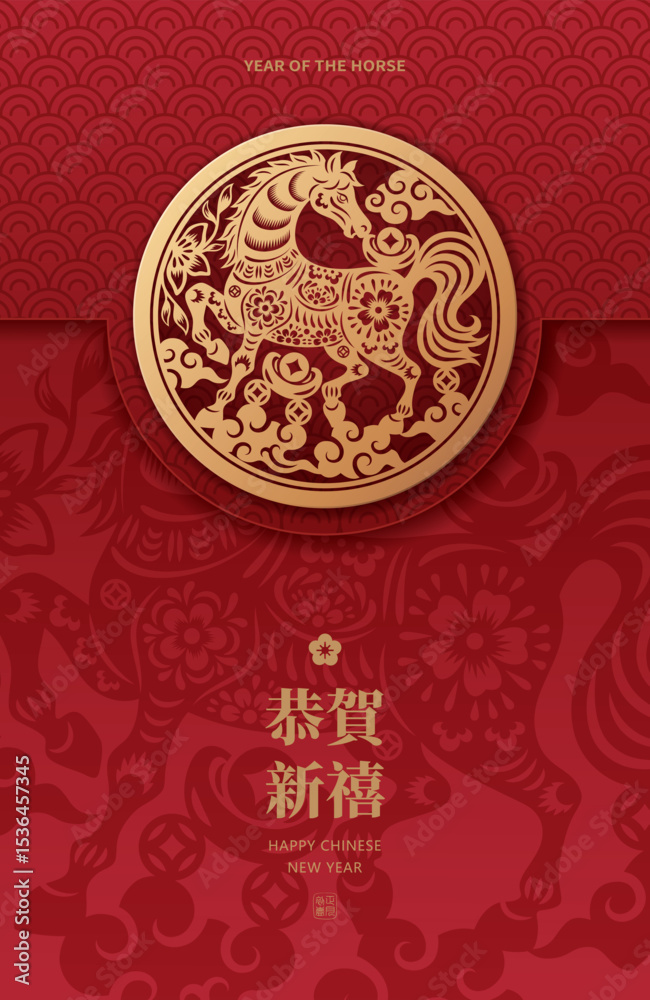 Happy Chinese new year poster. Year of the Horse. Translation: Best wishes for a happy new year and the first day of Chinese New Year. #1536457345