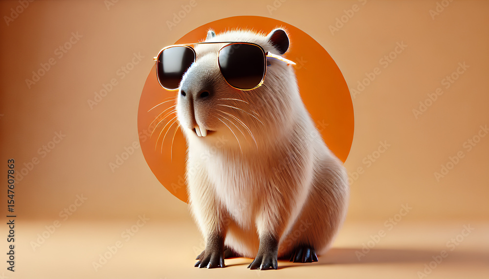 Happy cool capybara with sunglasses on orange colour background with copy space. Cute Fun night party animal creative concept. Generative AI. #1547607863
