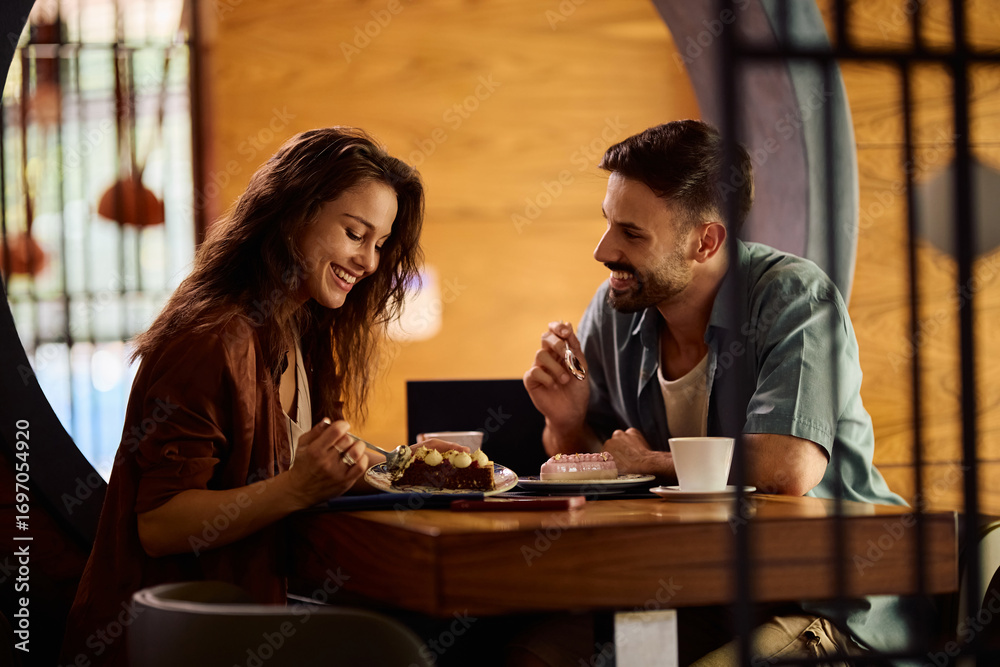 Happy couple enjoying while eating cake and communicating in cafe. #1697054920