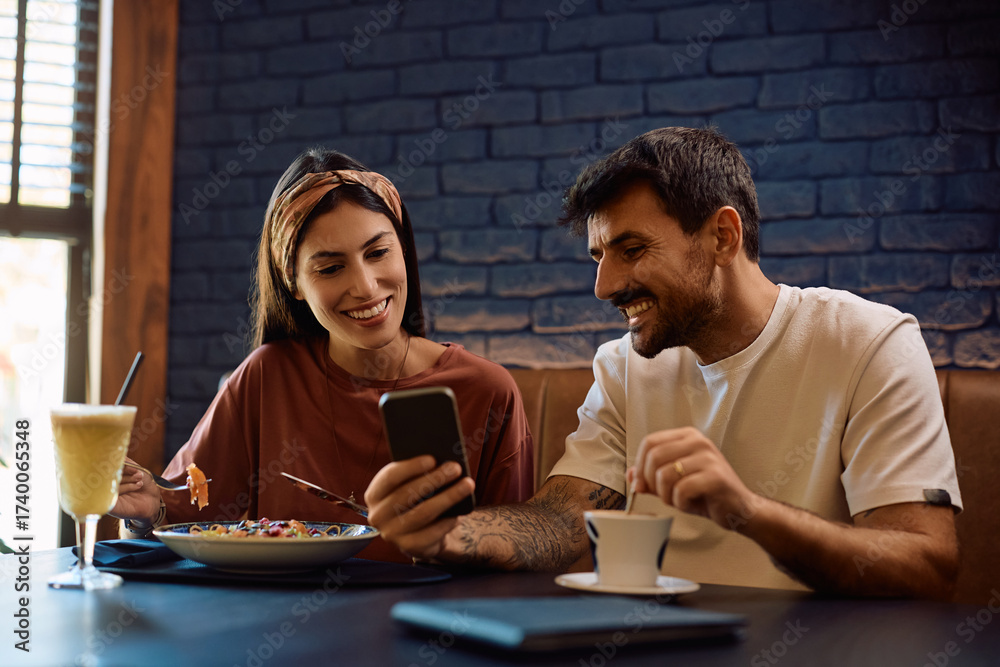 Happy couple reading text message on cell phone in restaurant. #1740065348