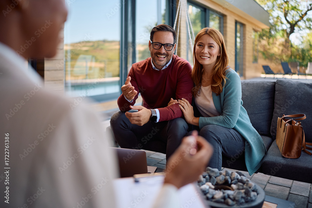 Happy couple talking to their insurance agent while buying new home. #1722761386