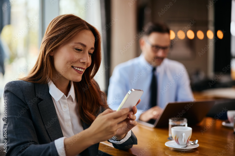 Happy female entrepreneur texting on cell phone during business meeting in cafe. #1735571664