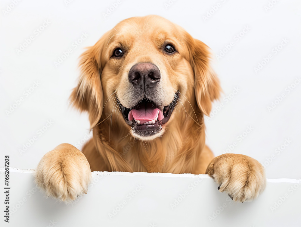 Happy golden retriever or Canis lupus familiaris peeking out and hanging its paw on blank poster board against white background. Blank copyspace for text. #765267203