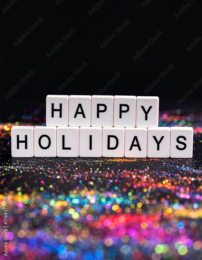 Happy Holidays text word banner letter tiles on black background isolated modern simple aesthetics, new year party vibes greeting card with colorful blurred glitters shining #1769375009