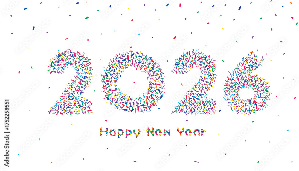 Happy New Year 2026 background design with colorful typography and confetti. #1752258551