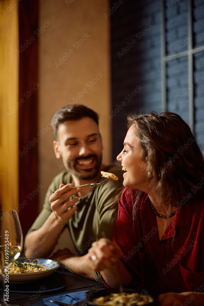 Happy woman being fed by her boyfriend during a lunch in restaurant. #1697053489