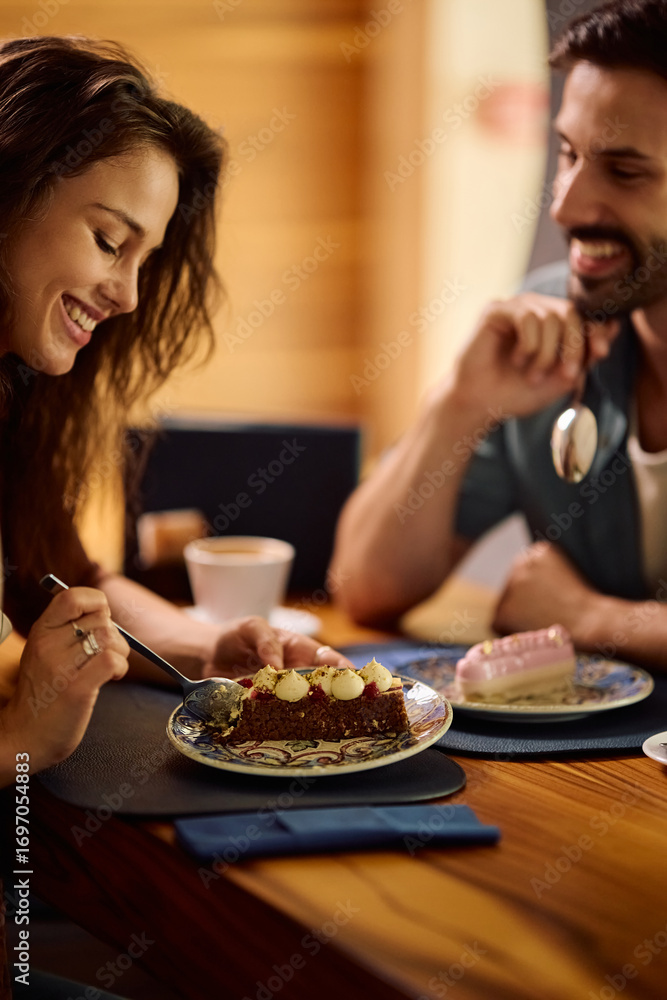 Happy woman eating cake while being with her boyfriend in cafe. #1697054883