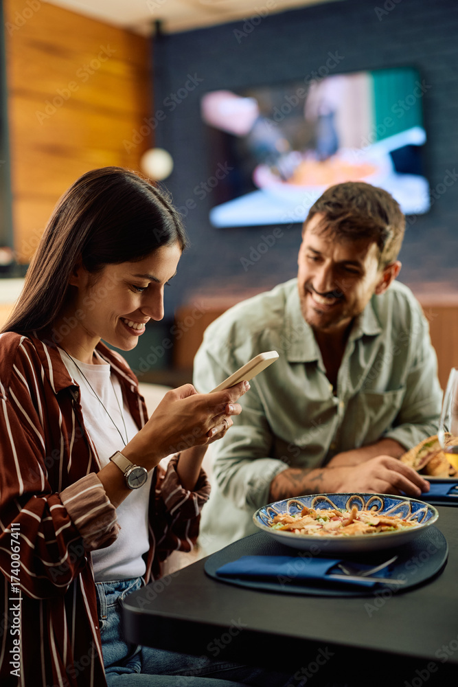 Happy woman using cell phone while eating with boyfriend in restaurant. #1740067411