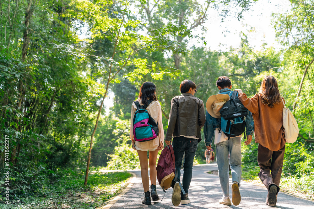 Happy young Asian man and woman travel nature mountain hiking and camping on summer holiday vacation. Generation z people friends enjoy active lifestyle walking forest trail together in sunny day. #1741852217