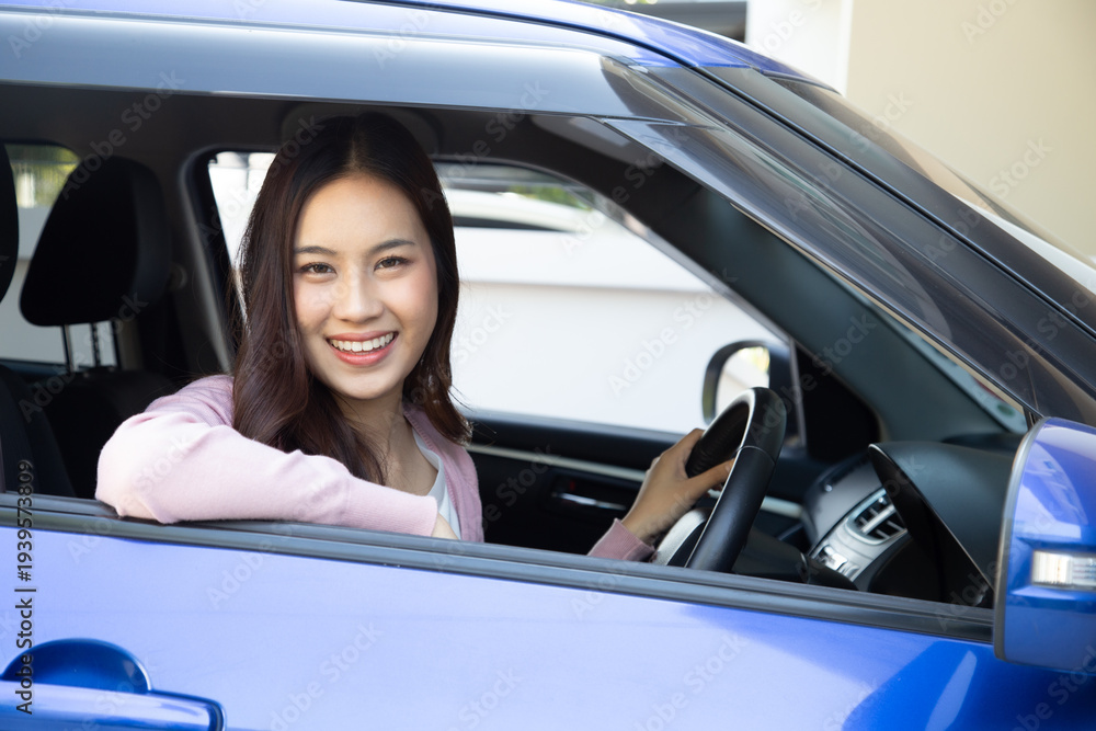Happy young Asian woman sitting in a blue car, smiling and pointing out of the window. Perfect for themes of road trips, summer travel, vehicle insurance, and new car ownership #1939573809