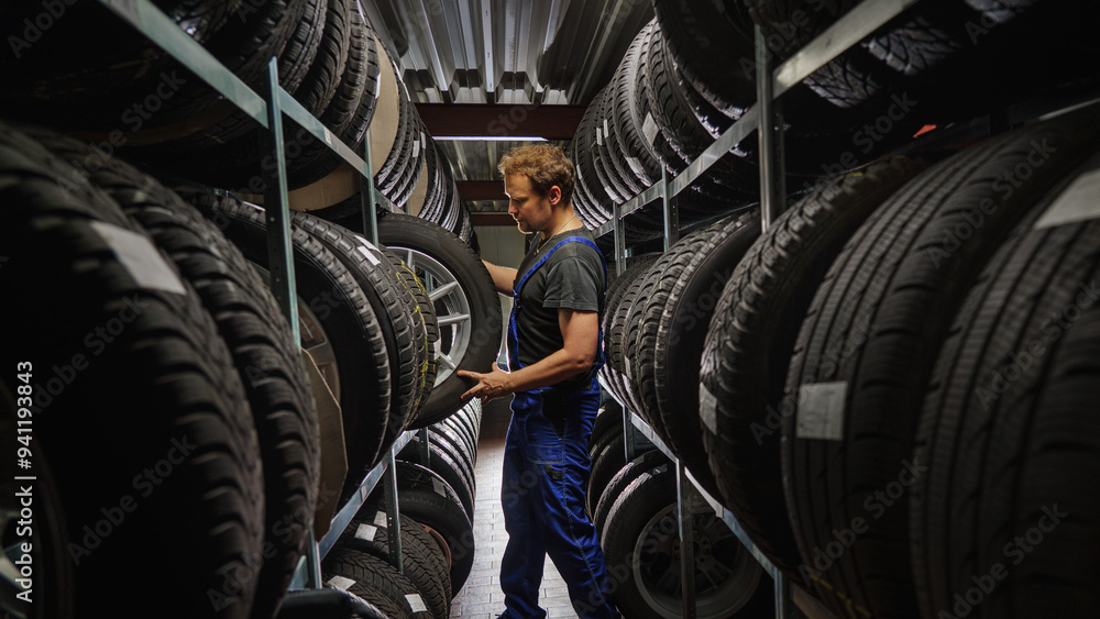 Hardworking experienced worker holding tire and he wants to change it In the tire store. Selective focus on tire. #941193843