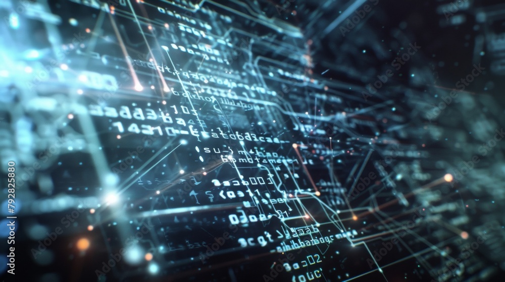 Hazy and distorted image of circuitry and mathematical equations showcasing the intricate calculations and algorithms utilized in quantum computing. . #792825880