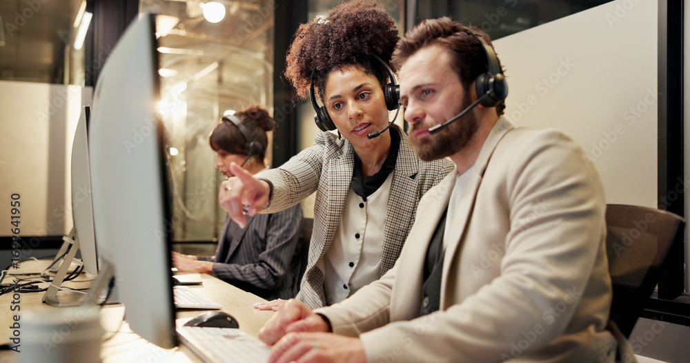 Headset, computer and call center agent with manager in office for feedback on crm or contact us. Communication, advice and technical support consultants with online customer service in workplace. #1699641950