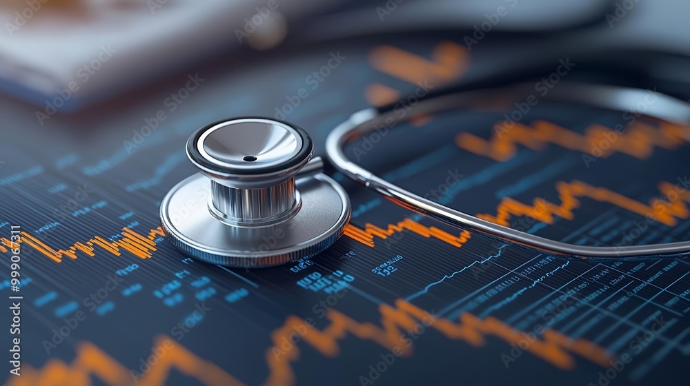 Healthcare analytics concept with stethoscope on illuminated data charts, futuristic medical diagnostics, digital health innovation #999067311