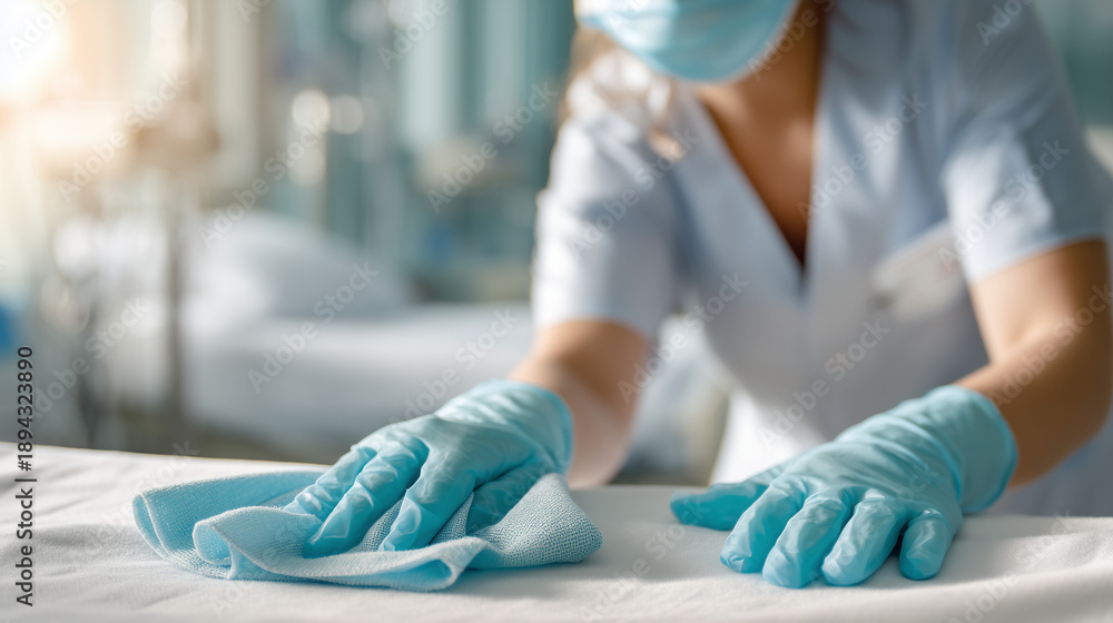 Healthcare professional disinfecting a hospital bed surface. Strong visual for medical services, hygiene campaigns, infection control, clinics and elderly care advertising. #1894323890