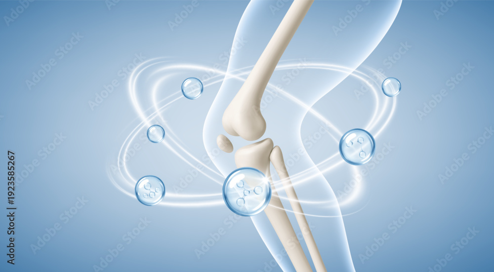 Healthy knee joint of a human leg with vitamins and minerals around it. Vitamin, сollagen, minerals and calcium for healthy bone joint. Vector realistic illustration #1923585267