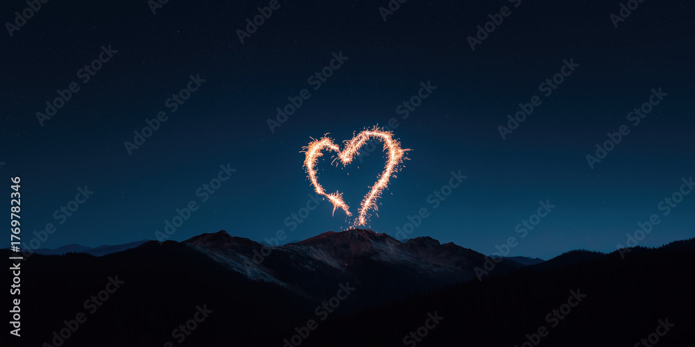 Heart-shaped firework glowing over mountain landscape at night. Romantic celebration concept for Valentine’s Day or New Year. #1769782346