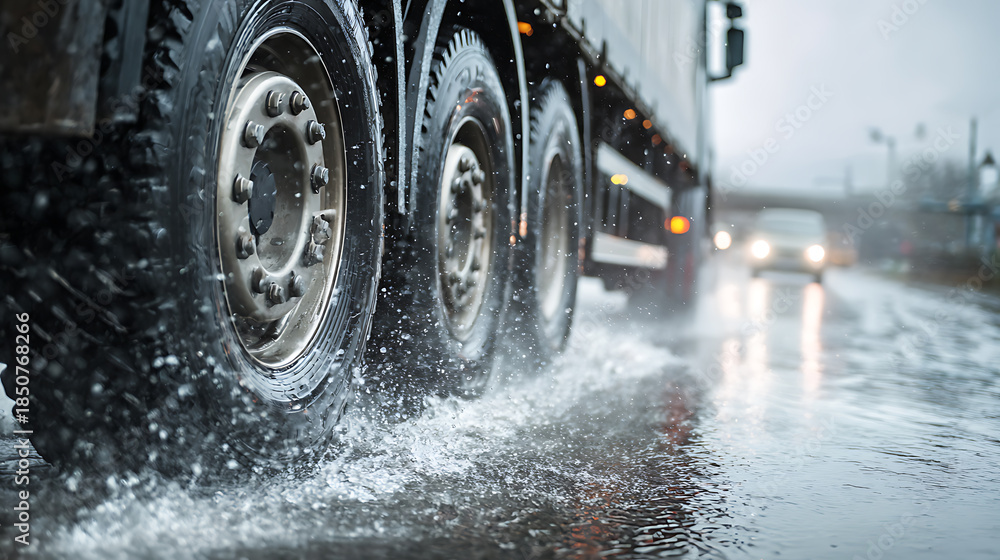 Heavy truck tires splashing through a flooded road in wet conditions, showcasing transportation challenges and the impact of bad weather on commercial vehicles. #1850768266
