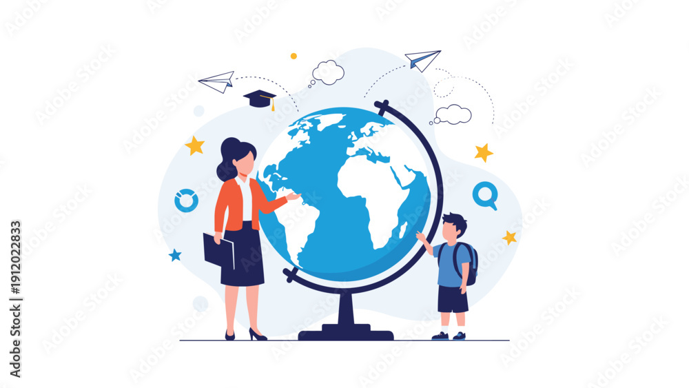 Helpful teacher pointing at a large globe while explaining a lesson to a young student, with educational icons floating in the background design. #1912022833