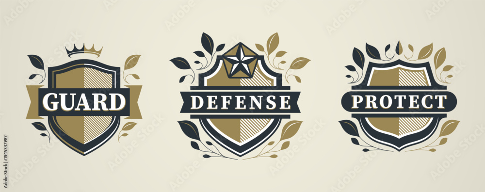 Heraldic shield symbol representing protection set, security reliability, inspired by defense systems, safety services and trust-based organizations. #1945347987