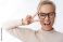 Hey smile you. Portrait of cheeky and cute glamour blond woman in glasses combed hair and sweater winking happily showing peace victory gesture as fooling around, being optimistic #268671260