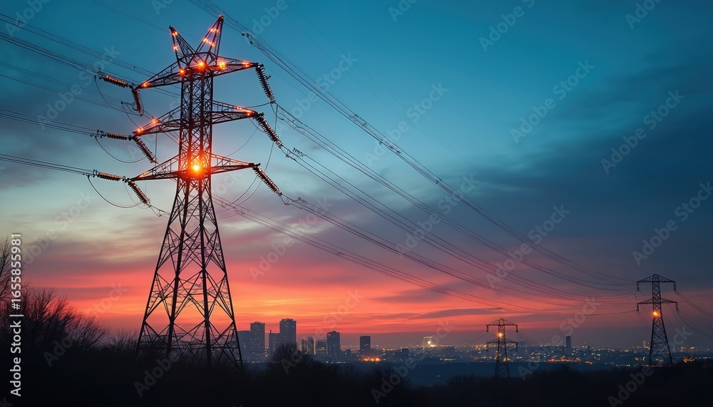 High voltage pylon structure with illuminated crossbars against vibrant twilight sky. Distant city skyline with skyscrapers under dramatic orange, blue clouds. Electrical power transmission lines #1655855981