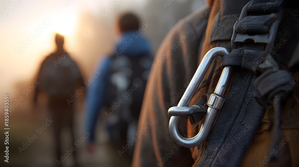 Hikers traverse a foggy morning trail with a detailed view of climbing gear in the foreground #1859403591