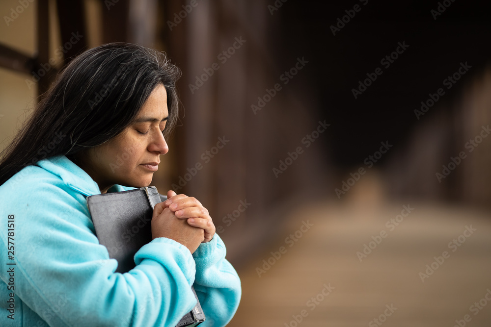 Hispanic Woman Sitting On A Bridge Praying While Holding Bible #257781518