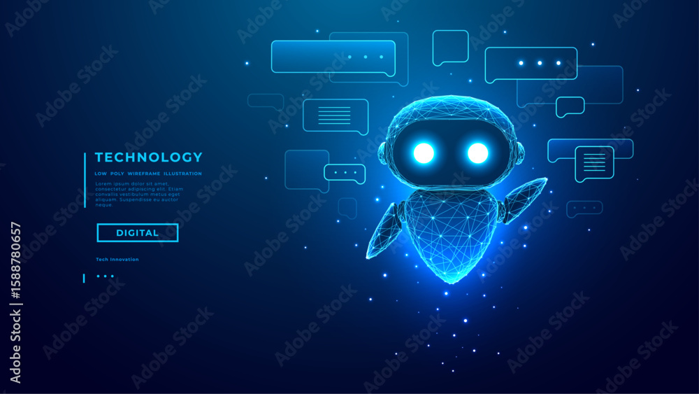 Hologram of AI Robot or Chatbot with Speech Bubbles on Technology Blue Background. AI Chat Bot Mascot. Low Poly Wireframe Tech Bg. Support Assistant Virtual Character. Digital Vector Illustration. #1588780657