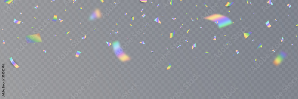 Holographic confetti falling frame. Rainbow light hologram background. Prism lens. Shiny festive decor. Crystal texture. Party celebration. Glamour design. Vector Illustration #1576240970