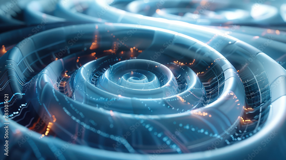 Holographic fibonacci spiral floating in a modern financial analysis lab dynamically representing market trends and fluctuations with its evolving patterns. Generative AI. #785103621