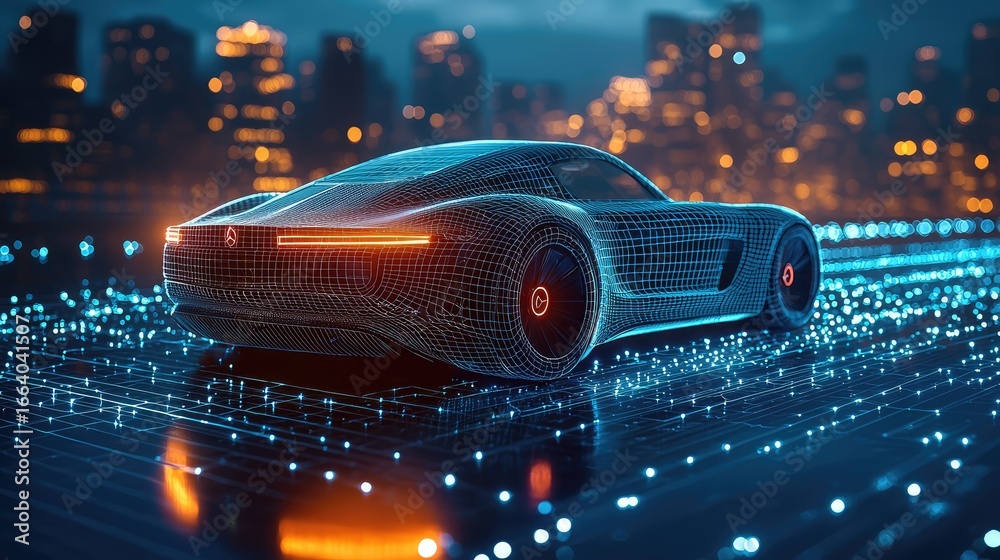 Holographic interface showing a 3D wireframe model of a concept sports car on a workbench. Concept for augmented reality in automotive engineering, EV battery development, and innovative R&D. #1664041507