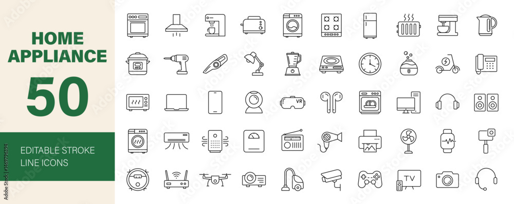 Home appliance icon set. Containing washing machine, vacuum cleaner, refrigerator, TV, blender, microwave, devices, kitchen, household and more. Editable line icons. Vector illustration. #1469796394