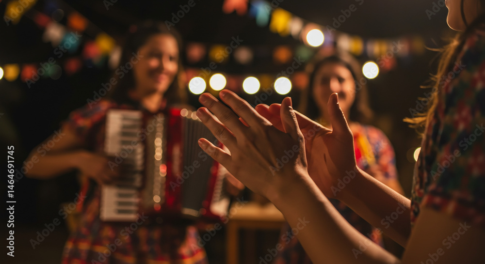 Homem tocando acordeão em uma celebração de Festa Junina, com pessoas dançando, aplaudindo e sorrindo ao fundo, sob bandeirinhas coloridas e luzes festivas #1464691745