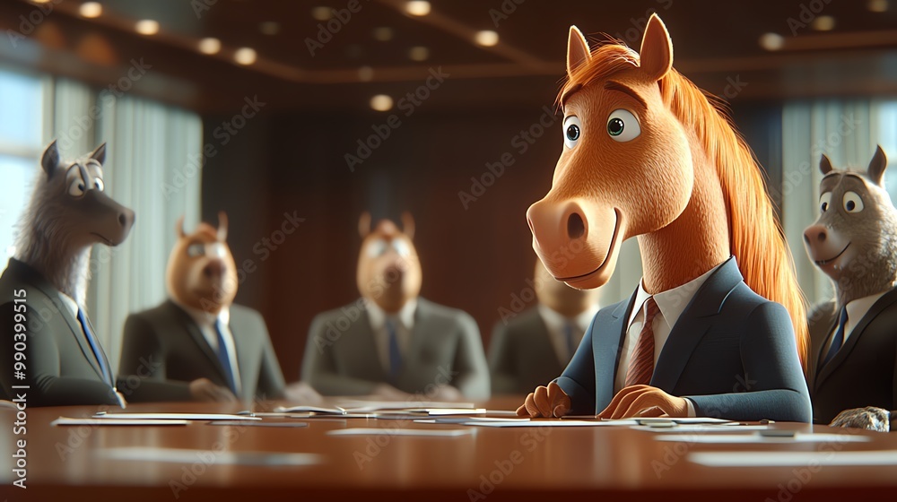 Horse leading a corporate boardroom discussion with animal executives, professional and dynamic, cartoon style #990399515