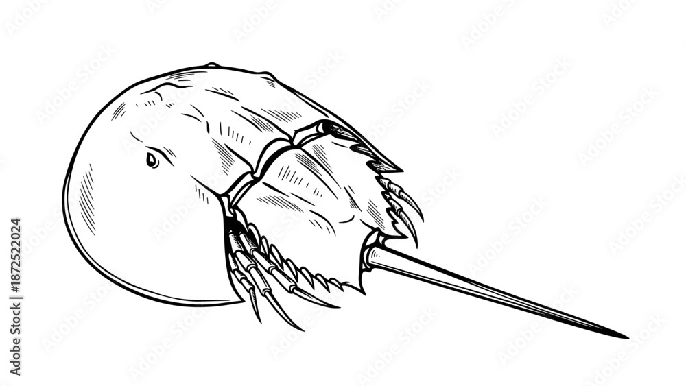 Horseshoe Crab illustration monochrome ink painting style on white background. Detailed Horseshoe Crab artwork captures unique marine arthropod, showcasing its distinctive shell, tail. #1872522024