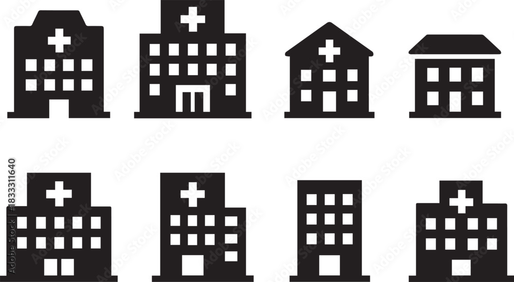 Hospital building icon set. Hospital and healthcare silhouette. Icon symbol of hospital building, healthcare, clinic. #1833311640