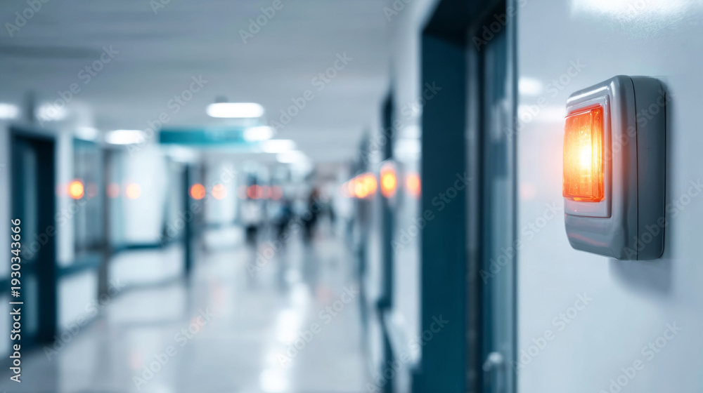 Hospital corridor with an illuminated orange alert light, symbolizing a medical emergency and urgent care in a modern clinic environment #1930343666