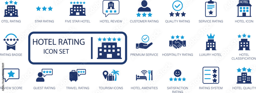 Hotel rating and hospitality icon set, star, quality, luxury, service, travel, and guest review vector icons. #1833220869