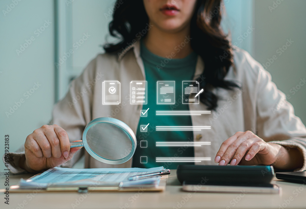 HR professional analyzing checklist and employee data with magnifying glass and digital interface, representing candidate evaluation, recruitment process, audit, and workflow management #1967923183