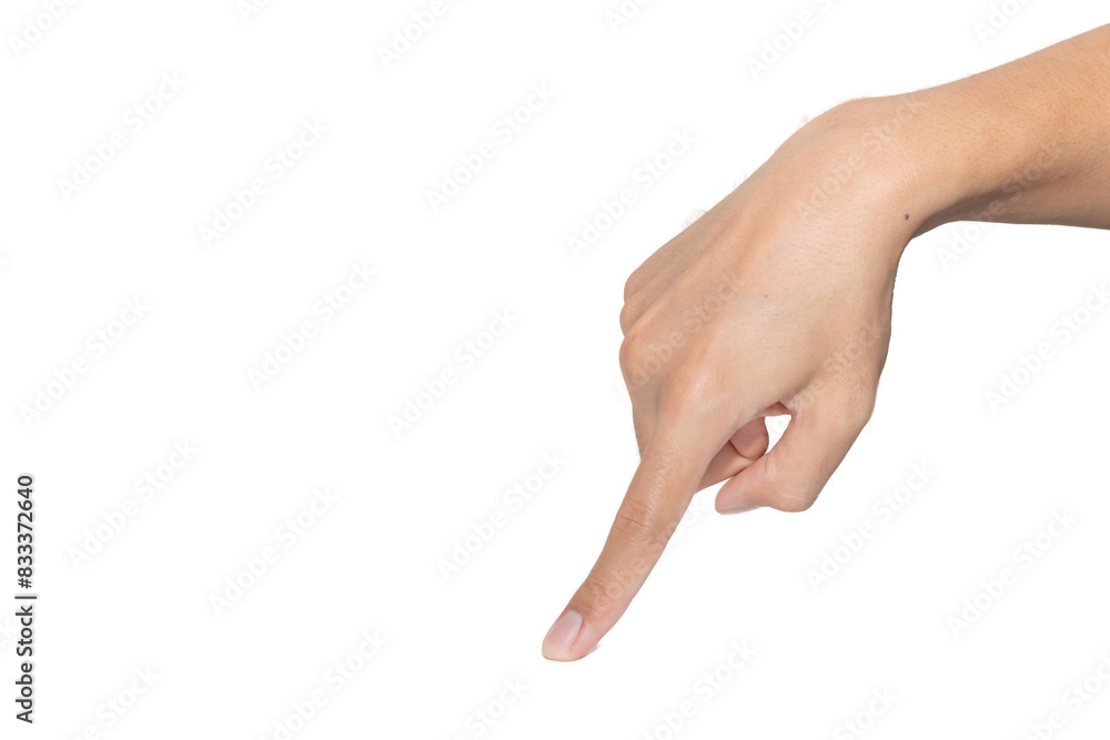 Human hand point down with index finger on transparent background. Gesture for touchscreen interface, direction, selection, or digital interaction. Isolated studio shot with copy space, clipping path #833372640