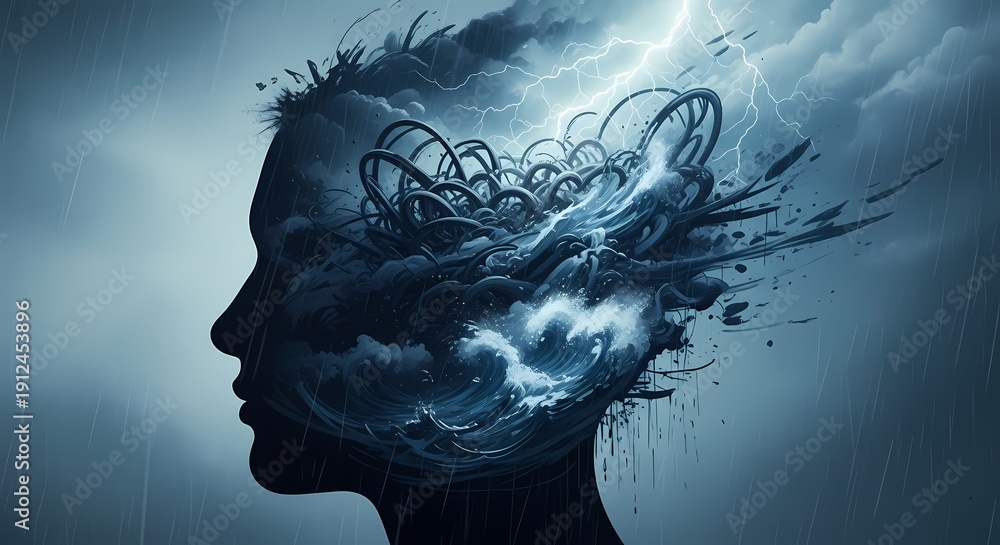 human head silhouette featuring a violent ocean storm with lightning bolts and dark clouds inside, symbolizing severe emotional turmoil, mental health crisis, and inner chaos #1912453896