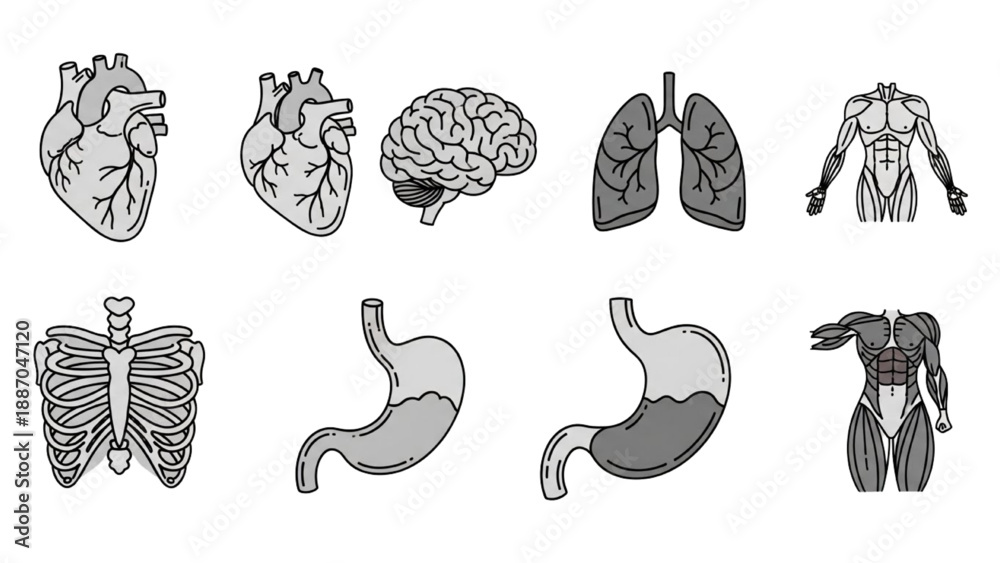 Human internal organs illustrated in a detailed educational diagram showcasing anatomy from various viewpoints #1887047120