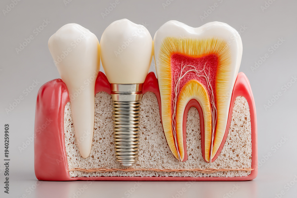 Human jawbone cross-section with dental implant, gum layers, and osseointegration detail #1940259903