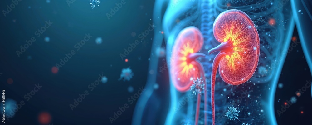 Human kidney cross-section digital art. Red and yellow glowing internal structures. Blue transparent human torso outline. Microscopic particles float in dark void. #1846110846