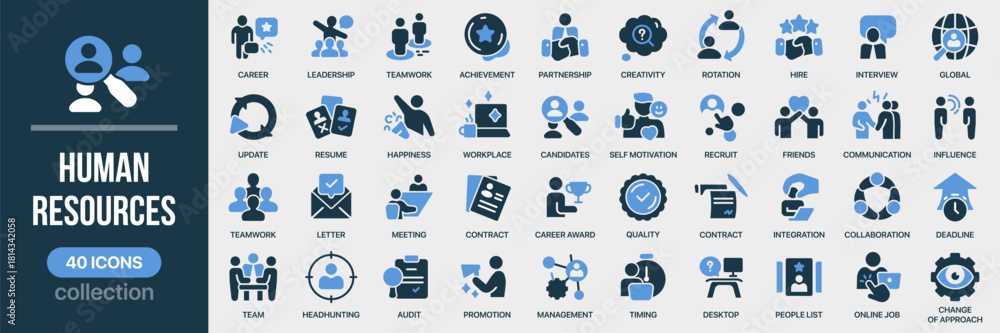 Human resources fill icon collection. Set of teamwork, recruitment, leadership, communication, motivation, and cooperation icons. Created in colored style with blue palette #1814342058